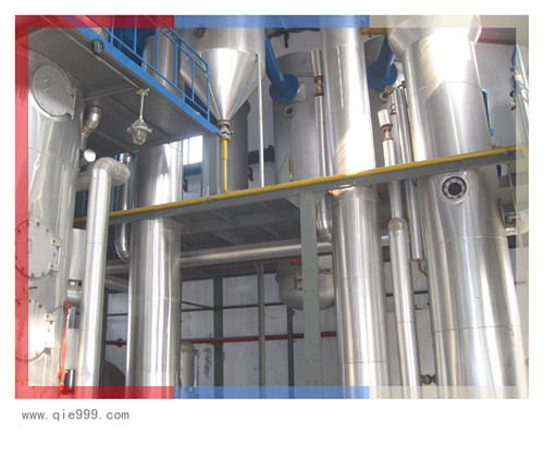 從浸出器流出的液體是含有油脂和溶劑的混合油。將混合油中的溶劑分離出來(lái)是利用溶劑和油脂的汽化溫度不同,我公司目前主要采用負(fù)壓蒸發(fā)工藝,可減少溶劑的泄露,降低溶劑的消耗。分離出的溶劑汽體進(jìn)行冷凝冷卻回收后送回浸出器再次使用,提高溶劑的使用效率。